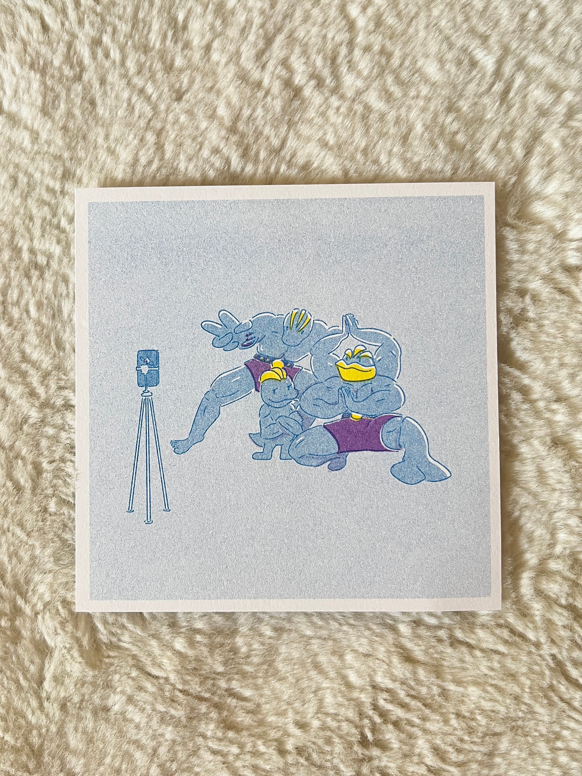 Small 5x5 (approx.) risograph print using orchid, yellow, and blue ink.
